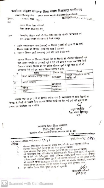 कार्यालय संयुक्त संचालक शिक्षा संभाग बिलासपुर द्वारा जारी आदेशानुसार हिंदी साहित्य (स्नातक ) एवं संस्कृत साहित्य (स्नातक अथवा स्नातकोत्तर ) विषय के अंतर्गत ऐसे शिक्षक जिनकी नियुक्ति अथवा वरिष्ठता दिनांक 21.06.2007 तक , अंग्रेजी साहित्य 22.10.19 तक (एलबी संवर्ग में तीन वर्ष अनिवार्य नियमानुसार ) , गणित 06.09.2019 तक एवं विज्ञान विषय 29.07.2008 तक नियुक्ति वाले शिक्षकों की गोपनीय प्रतिवेदन एवं चल - अचल संपत्ति जमा करने कहा गया है। ताकि पदोन्नति की कार्यवाही को आगे बढ़ाया जा सके।